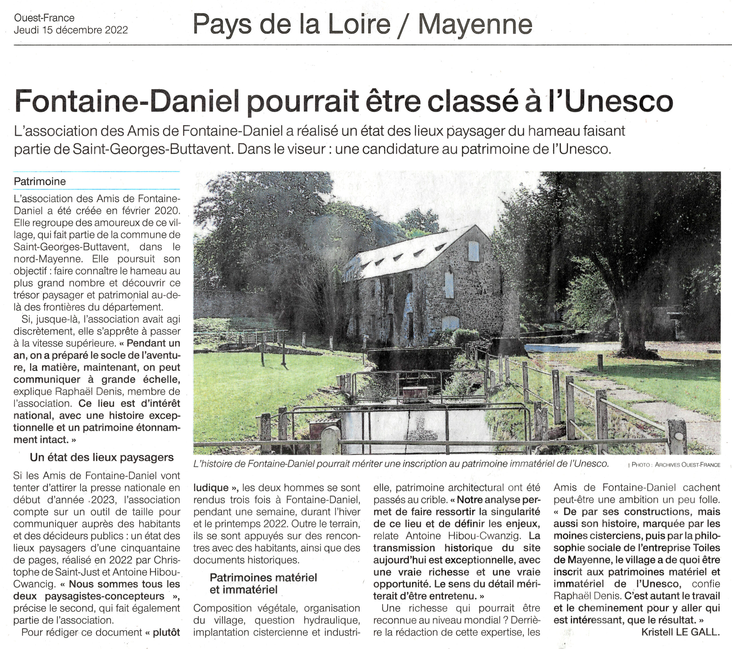 En 2022, l’association Amis de Fontaine-Daniel a demandé à Christophe de Saint-Just et Antoine Hibou Cwancig, paysagistes-concepteurs, de dresser un état des lieux, précis, des paysages préservés de Fontaine-Daniel.